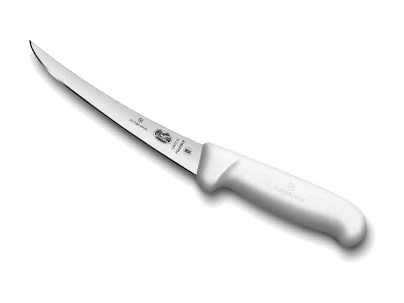 Couteau désosser, lame étroite flexible 12 cm inox, dos renversé, manche fibrox jaune.