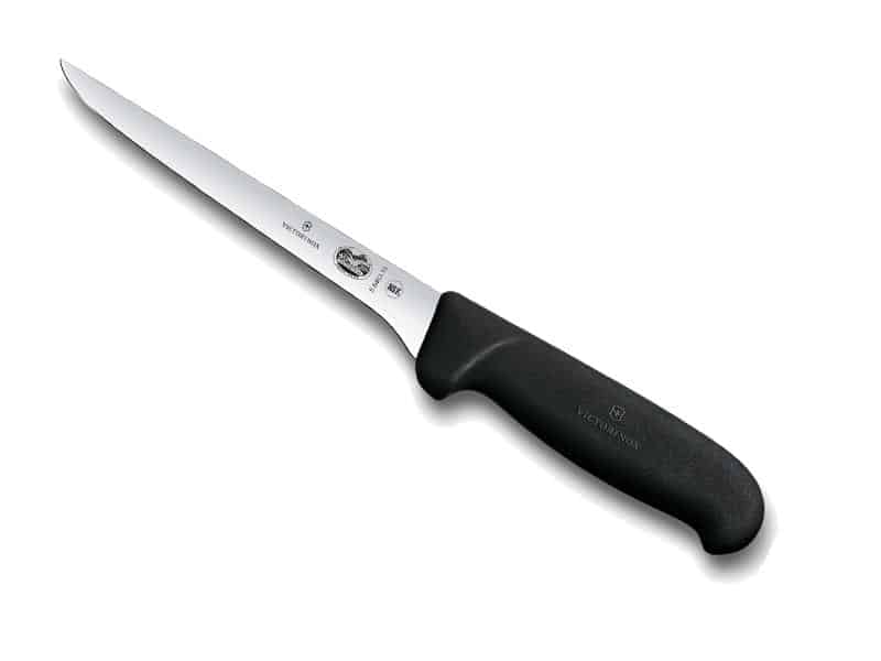 Couteau désosser, lame étroite flexible usée 12 cm inox, dos droit, manche fibrox noir.