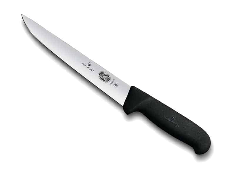 Couteau saigner/découper, lame 22 cm inox, dos droit, manche fibrox bleu.