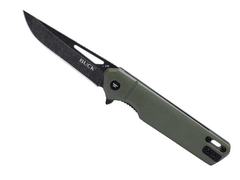 Couteau BUCK « INFUSION » n°0239GRS1, lame noire à trou acier 7cr avec « flipper », système d’ouverture assistée, et cran intérieur, manche 12 cm G10 naturel avec trou de lanière, avec clip.