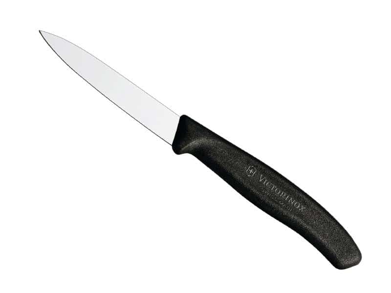 Couteau office, lame 8 cm inox, pointe milieu, manche polypropylène bleu.