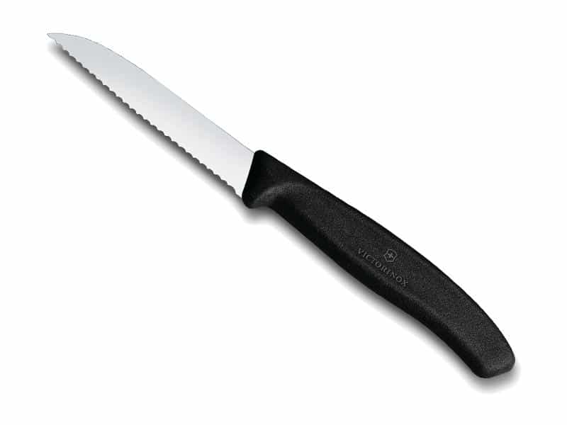 Couteau office, lame crantée 8 cm inox pointe rabattue, manche polypropylène rouge.