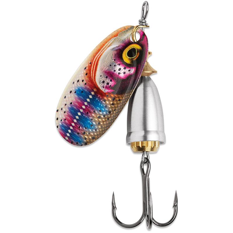• Palette inclinée à 45° – nage entre 0,6 et 1,2 m • Corps principal breveté en deux parties, usiné en laiton • Engrenage en laiton tournant librement avec effet bruiteur • Axe en acier inoxydable • Disponible en finitions laiton brut, plaqué argent ou cuivre, peintes et imprimées • • Hameçon VMC® monté d’origine • Lest situé à l’arrière pour des lancers sans bouclage et d’une grande précision • Palette ovale, papillonnante, se met en rotation dès qu’elle touche l’eau.